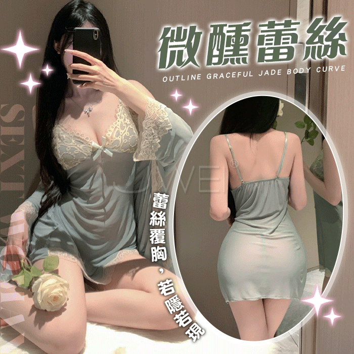 微醺蕾絲.性感深V露溝睫毛蕾絲覆胸美背睡裙-綠色【外袍+睡裙+T褲】