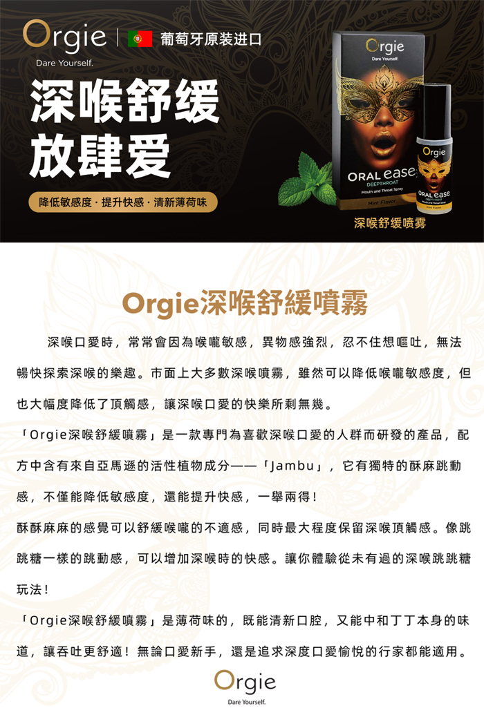 葡萄牙Orgie.Oral Ease 深喉舒緩噴霧~溫和不麻~提升口愛快感 15ml