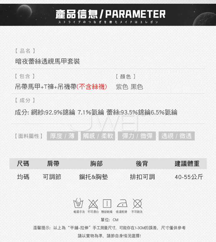 ■內容物:吊帶馬甲+T褲+吊襪帶 ■適穿尺寸:FREESIZE ■彈性:微彈 ■未撐開平量尺寸正負誤差1~2cm,1吋=2.54cm ■注意事項:基於保障消費者個人衛生,此貼身衣物恕不接受退換貨。 (如為商品本身暇疵,接受七日內換貨,請勿試穿,謝謝您)