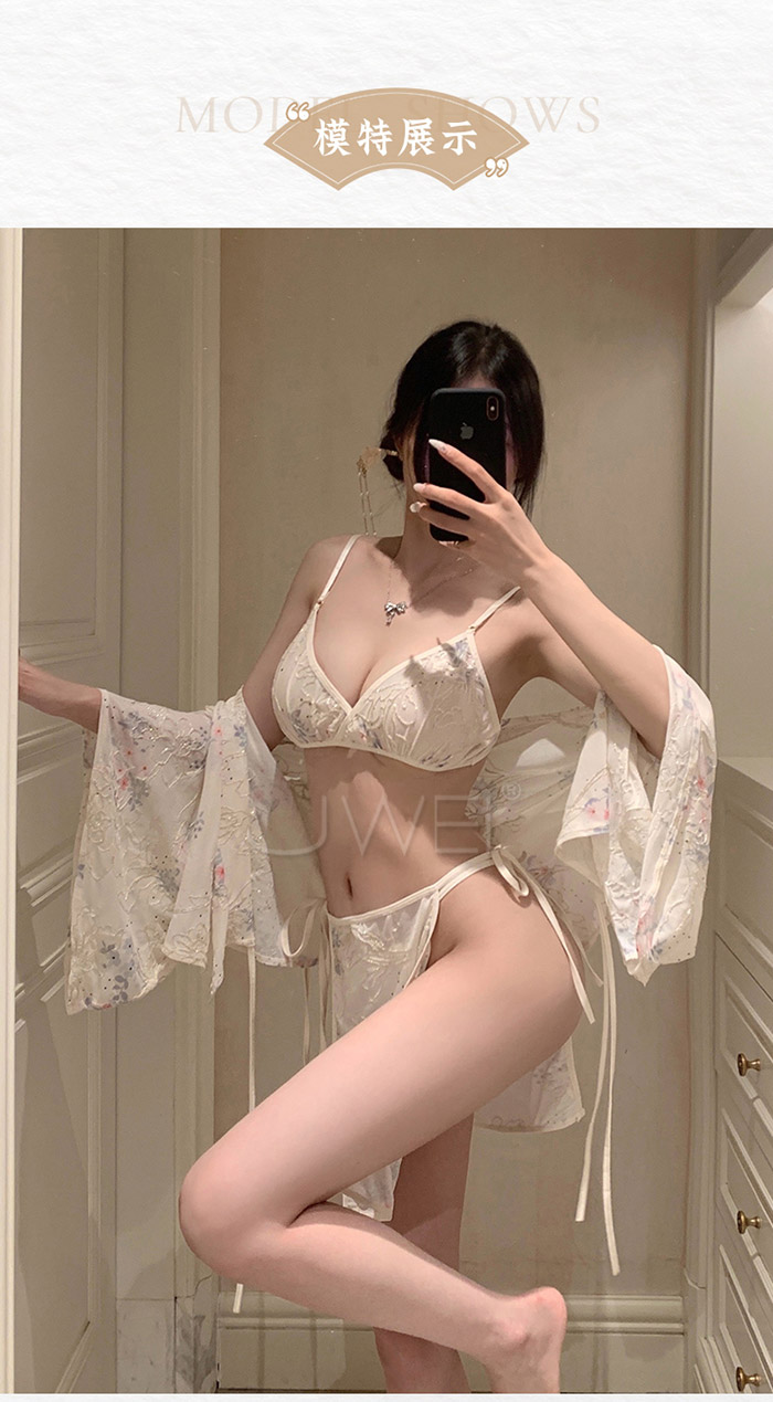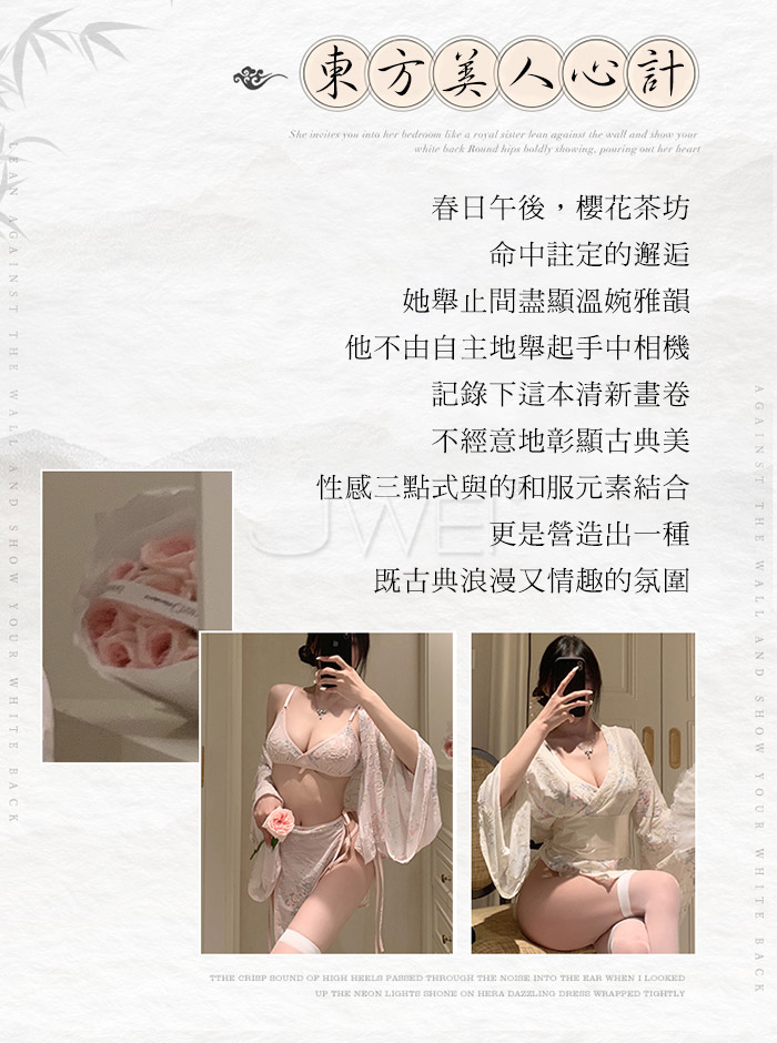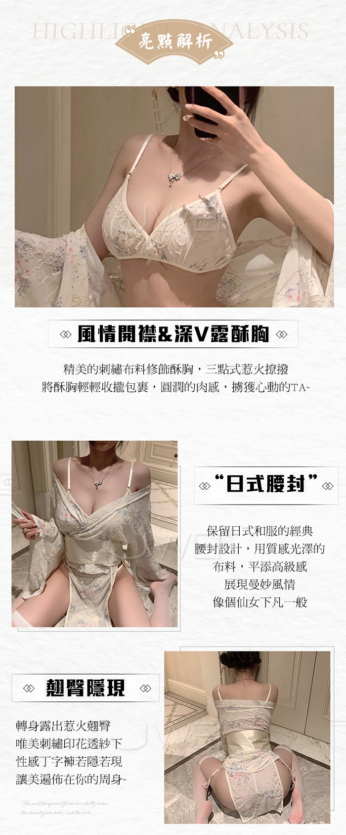 ■內容物:外套+胸罩+T褲+腰封+分片裙*2 ■適穿尺寸:FREESIZE ■彈性:微彈 ■未撐開平量尺寸正負誤差1~2cm,1吋=2.54cm ■注意事項:基於保障消費者個人衛生,此貼身衣物恕不接受退換貨。 (如為商品本身暇疵,接受七日內換貨,請勿試穿,謝謝您)