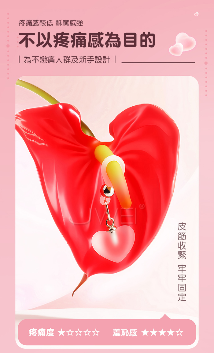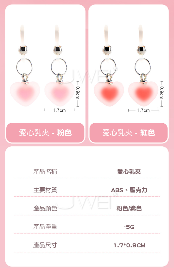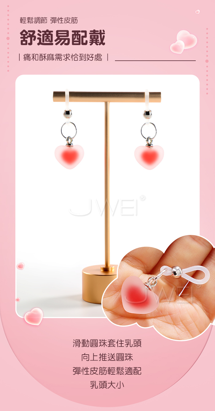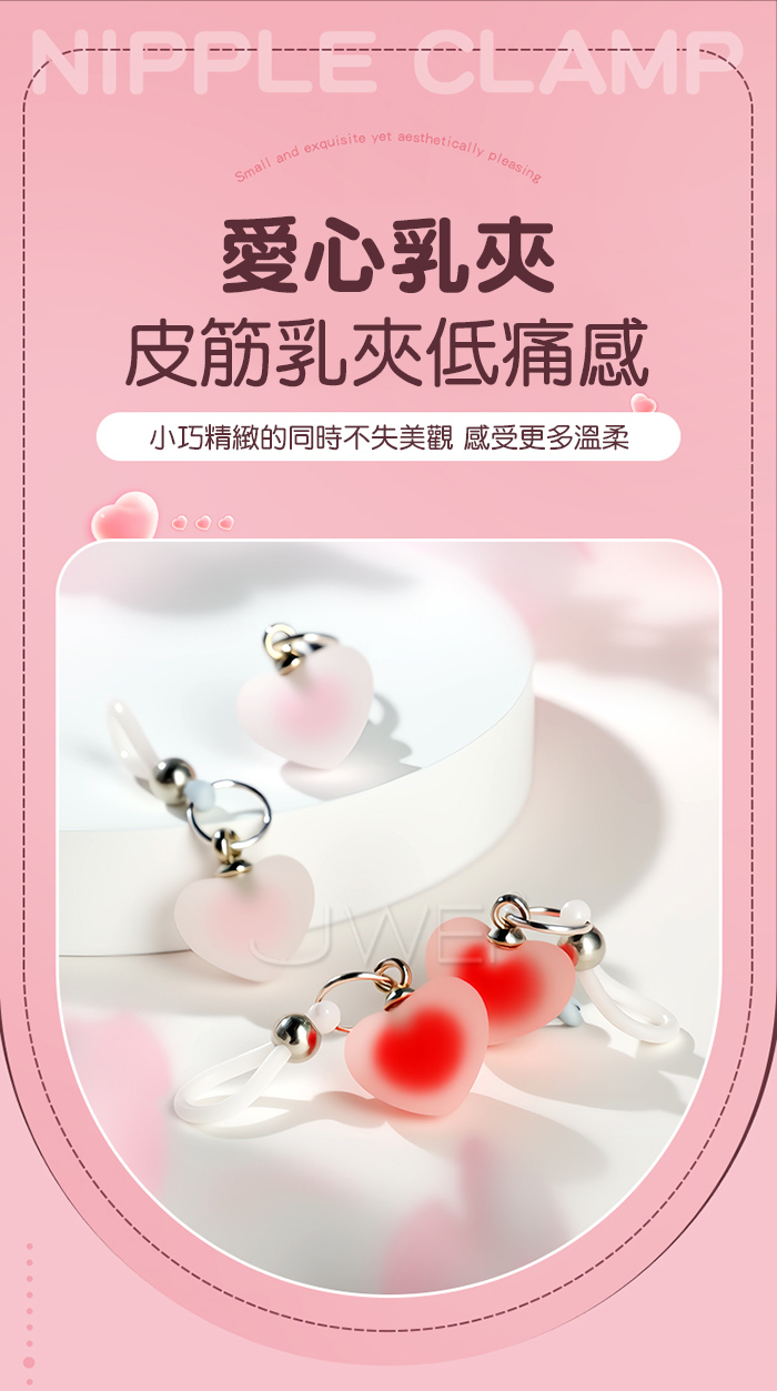 愛心乳夾,皮筋乳夾低痛感,小巧精緻的同時不失美觀 感受更多溫柔 疼痛感較低 酥麻感強,不以疼痛感為目的,專為不戀痛人群及新手設計 外出佩戴 羞恥感加倍,隔衣出門 隱蔽穿戴,無論峰頭大小緊抱雙峰 ■尺寸:大小詳如圖片標示 ■材質:ABS+壓克力