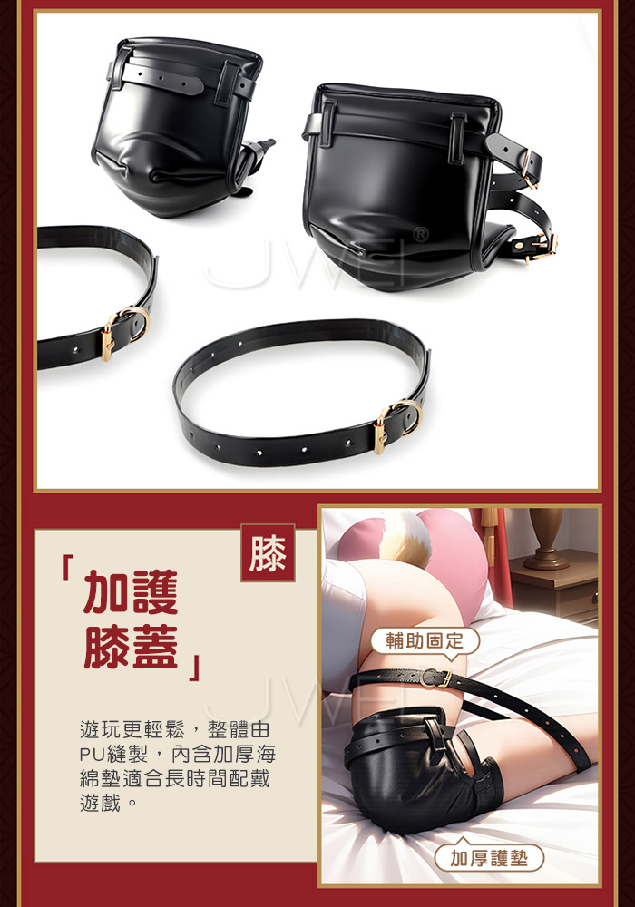 加厚海綿 跪爬不痛,肘膝防護,手肘膝蓋部位進行加厚處理層層加確保暢玩途中不傷害TA的身體。 遊玩更輕鬆,整體由,PU縫製,內含加厚海綿墊適合長時間配戴遊戲。 ■尺寸:大小詳如圖片標示 ■材質:PU+海綿 ■功能:閨房情趣、束縛調教 ■注意:SM道具請以安全、清醒、非強迫為使用原則,使用前請先徵得對方的同意;使用時如有任何不適,請立即停止使用。