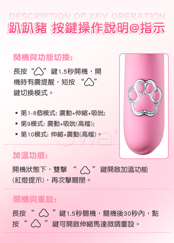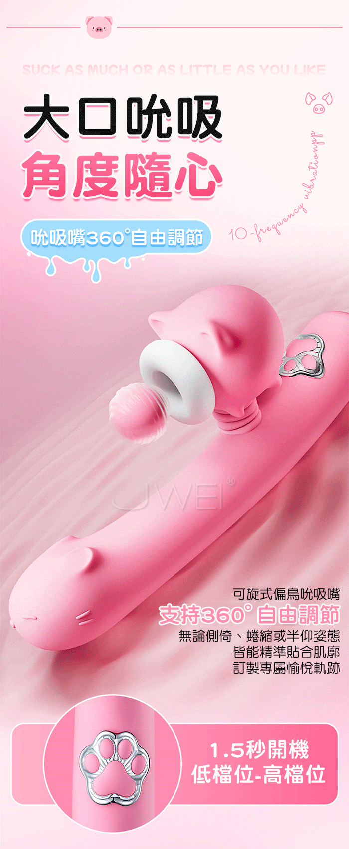 10頻強震大口吸力,深入探索極限快感,全方位穿透自動伸縮吸吮加溫 可旋式偏鳥吮吸嘴,支持360度自由調節無論側倚、蜷縮或半仰姿態皆能精准貼合肌廓 貓耳剮蹭,顛覆歡愉暢享絲滑入體高潮,黃金15度夾角,從猫耳到心間,感受剮蹭的每一刻溫柔 震感加倍,豬力全開爽玩還有,激發每一寸敏感的極致享受! 產品規格 ■材質: ABS+矽膠 ■規格: 詳如圖片標示 ■特色: 10頻震動、10頻伸縮、10頻吮吸、加溫