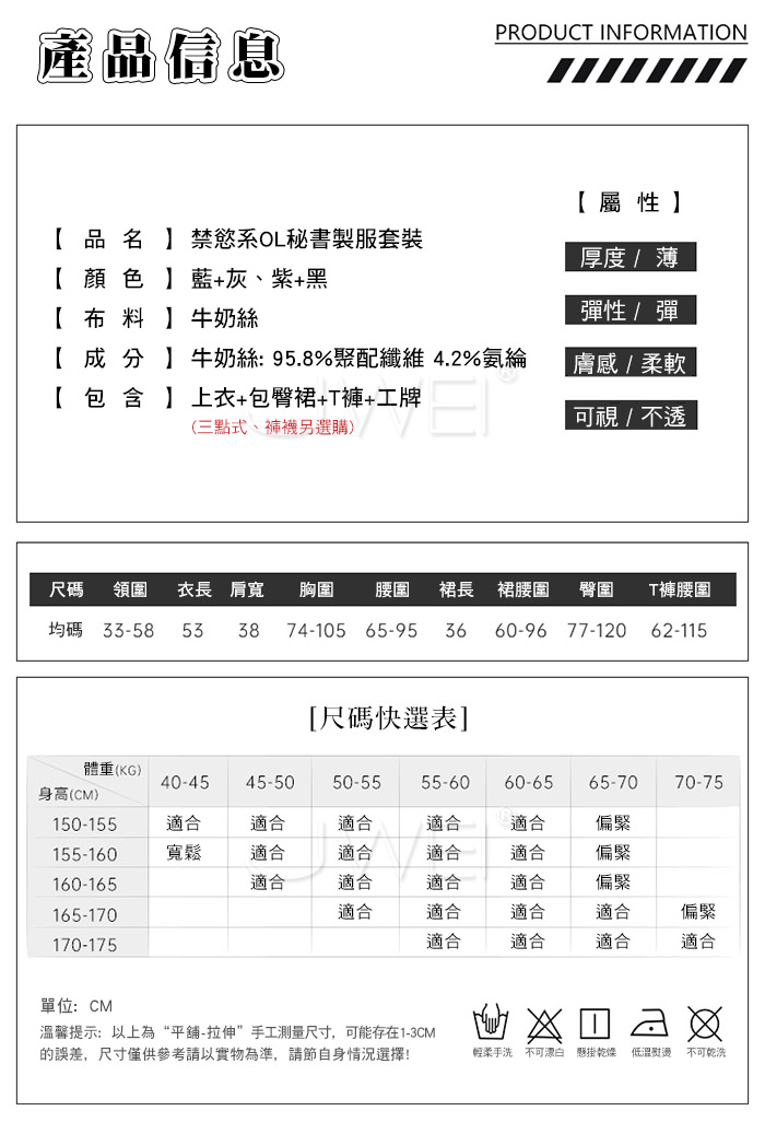 ■內容物:上衣+包臀裙+T褲+工牌 ■適穿尺寸:FREESIZE ■彈性:彈 ■未撐開平量尺寸正負誤差1~2cm,1吋=2.54cm ■注意事項:基於保障消費者個人衛生,此貼身衣物恕不接受退換貨。 (如為商品本身暇疵,接受七日內換貨,請勿試穿,謝謝您)