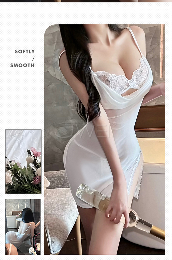 | 月暮迷紗.性感裸紗蕩領透視側開衩細肩帶美背睡裙【睡裙+T褲-白色】