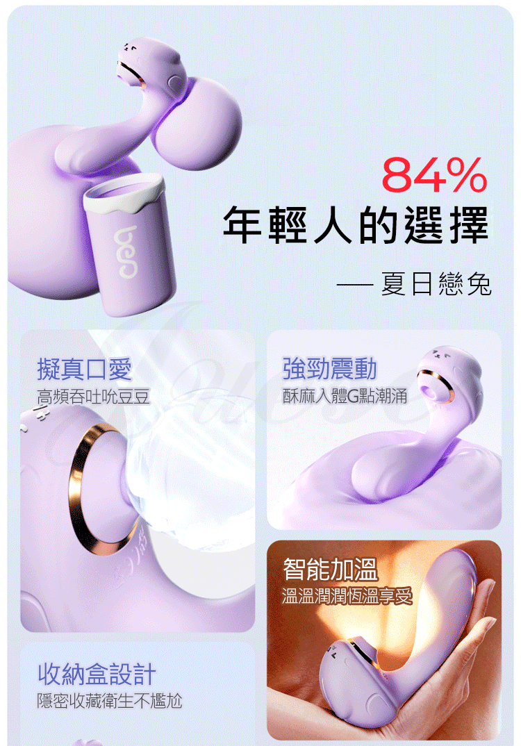 ►您現在的位置:首頁>姬欲.夏日戀兔 9段變頻吮愛激震USB充電智能加溫軟糯震動按摩棒-紫